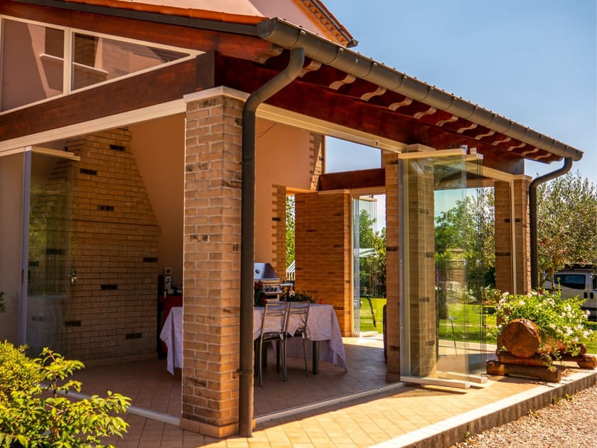Per beneficiare al meglio di nuovi spazi adatti per i giardini d'inverno, i balconi, terrazze o gallerie commerciali. Goditi di una vista senza limiti, senza alcun antiestetico profilo verticale. La tendenza degli ultimi anni, ha portato gli architetti, a un sempre più largo impiego di soluzioni in vetro, proponendo vetrate con determinate caratteristiche di prestazione. Vetrata di chiusura pieghevole ad impacchettamento a libro con pannelli in vetro, senza profili verticali. Il principale obbiettivo di questo prodotto è generare nuovi spazi protetti dalle intemperie, senza rompere l’estetica dell’ambiente, mediante un’installazione rapida, semplice, di facile manutenzione e pulizia. L’utilizzo della vetrata pieghevole e impacchetabile è ideale per ottimizzare gli spazi su balconi, terrazze, giardini e ristoranti, aumentando la sensazione di spazio, utilizzando luce naturale. Ideale per chiusure di ambienti aperti non utilizzati nel periodo invernale, risolve problemi di rumori ambientali con un abbattimento di 15/17 db grazie all’utilizzo di materiali di alta qualità.