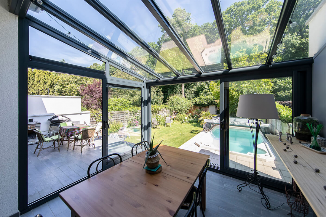 SUNLIGHT è un giardino d’inverno, una stanza outdoor studiata per ridisegnare gli spazi esterni in perfetta simbiosi con l’ambiente circostante, donando un nuovo senso di ampiezza e rivoluzionando il concetto di comfort e luce naturale in qualsiasi stagione dell’anno. SUNLIGHT può essere integrata con molteplici tipologie di chiusure, vetrate scorrevoli Line Glass a 3 vie o con il sistema di tende a caduta verticali Vertika Sunlight. La novita? principale di Sunlight consiste nel tetto in vetro stratificato da 10 mm composto da traversi porta vetro a passo realizzati in alluminio che lasciano ampia superficie alla parte vetrata, disponibile in due diverse finiture trasparente o bianco opaco. Una soluzione che regala luminosita? e leggerezza costruttiva all’ambiente. Disponibile in forma autoportante o addossata si presta ad essere inserita in spazi di forme diverse, coprendo metrature importanti, e con un impatto estetico minimale. È prevista la possibilità di illuminare il prodotto internamente grazie ad un sistema di strip led dimmerabili integrati rendendo il prodotto fruibile in ogni momento della giornata.