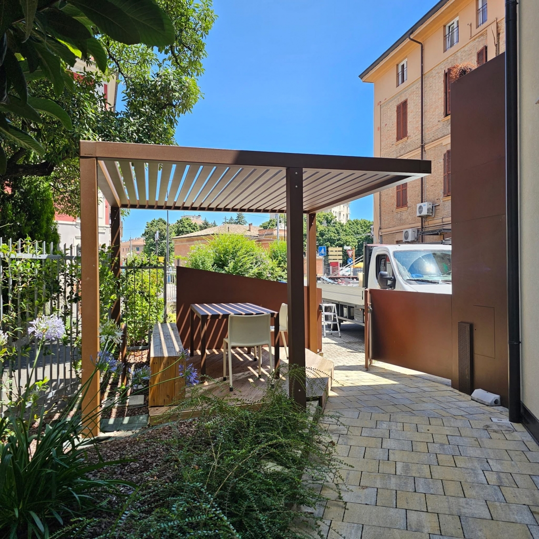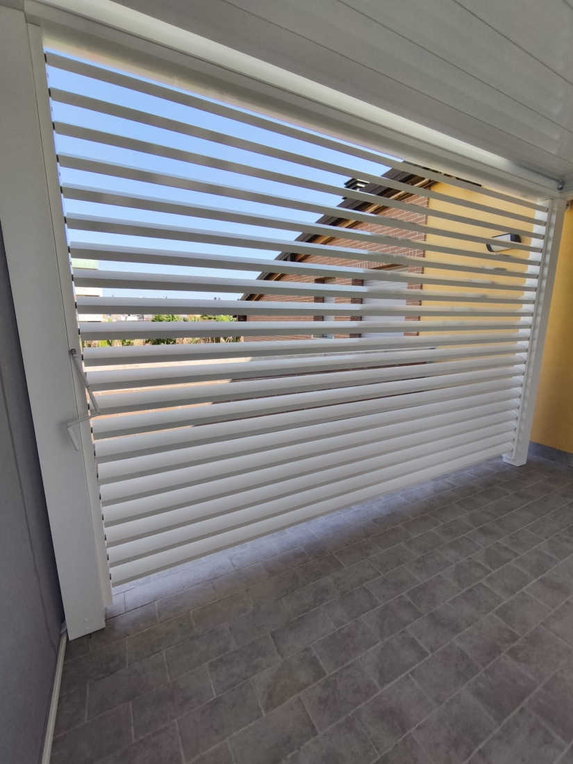Sistema di chiusura perimetrale con barre frangisole dal design moderno e contemporaneo, a scelta fisse o orientabili con sistema di movimentazione manuale (argano e manovella). Profili in alluminio estruso verniciato a base di resina di poliestere, altamente resistenti alla corrosione anche fronte mare. Lamelle di dimnsione 101x40 mm ancorate a telai/strutture in alluminio perimetrali. Di serie spazio libero tra le lamelle pari a 2 cm. Montabili sia in orizzontale e sia in verticale. Donano un tocco di design e privacy in più, utilizzabili ai lati di una pergola o come parapetto o separé.