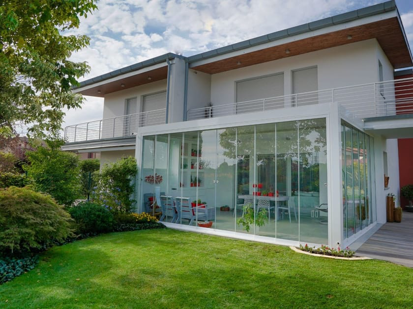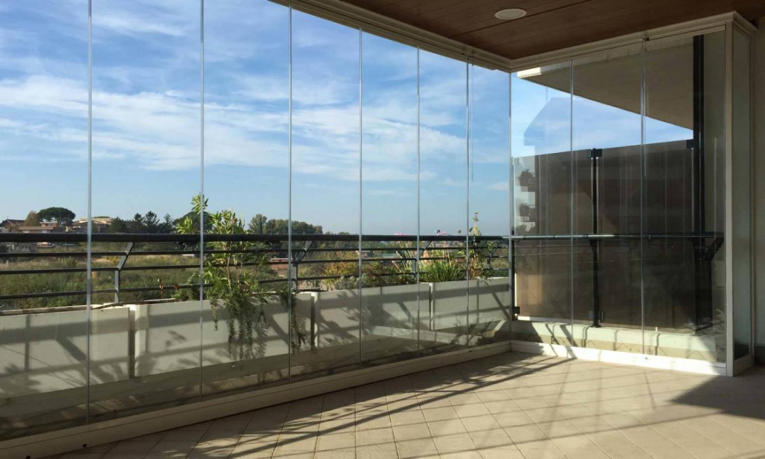 Per beneficiare al meglio di nuovi spazi adatti per i giardini d'inverno, i balconi, terrazze o gallerie commerciali. Goditi di una vista senza limiti, senza alcun antiestetico profilo verticale. La tendenza degli ultimi anni, ha portato gli architetti, a un sempre più largo impiego di soluzioni in vetro, proponendo vetrate con determinate caratteristiche di prestazione. Vetrata di chiusura pieghevole ad impacchettamento a libro con pannelli in vetro, senza profili verticali. Il principale obbiettivo di questo prodotto è generare nuovi spazi protetti dalle intemperie, senza rompere l’estetica dell’ambiente, mediante un’installazione rapida, semplice, di facile manutenzione e pulizia. L’utilizzo della vetrata pieghevole e impacchetabile è ideale per ottimizzare gli spazi su balconi, terrazze, giardini e ristoranti, aumentando la sensazione di spazio, utilizzando luce naturale. Ideale per chiusure di ambienti aperti non utilizzati nel periodo invernale, risolve problemi di rumori ambientali con un abbattimento di 15/17 db grazie all’utilizzo di materiali di alta qualità.