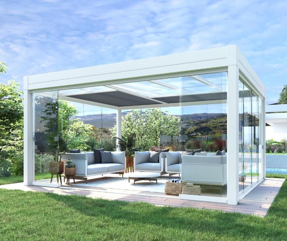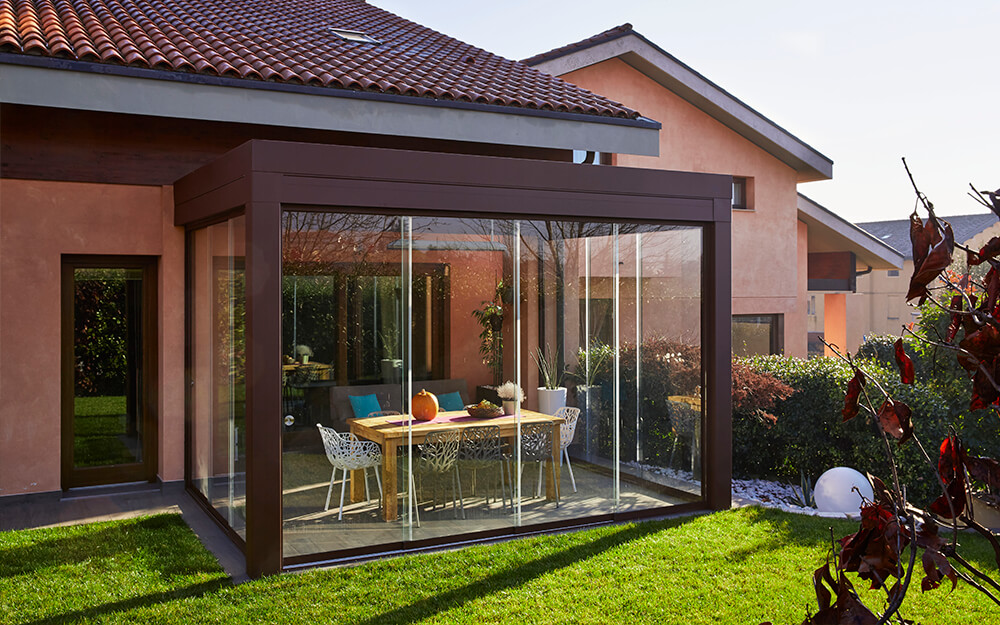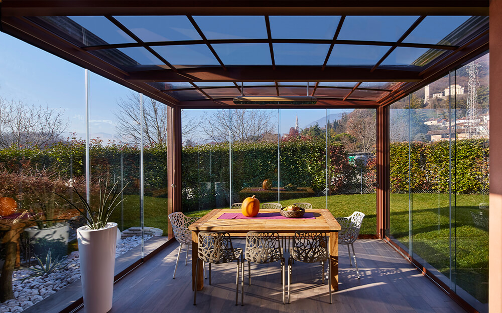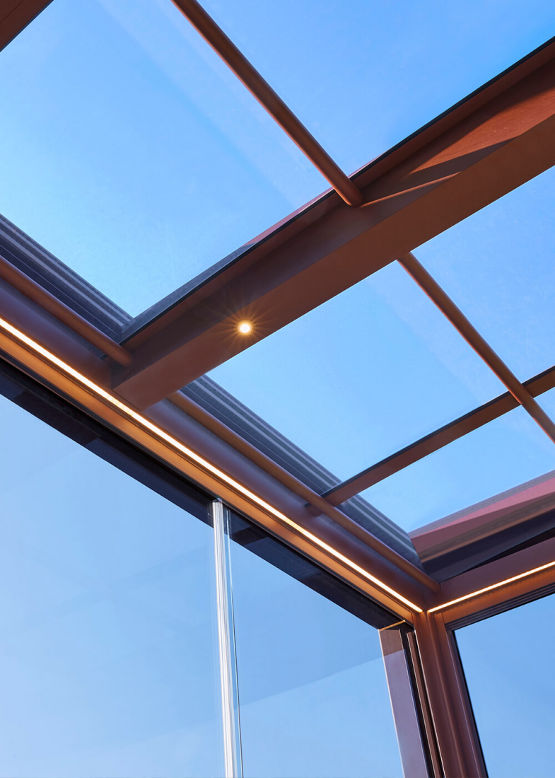 SUNLIGHT è un giardino d’inverno, una stanza outdoor studiata per ridisegnare gli spazi esterni in perfetta simbiosi con l’ambiente circostante, donando un nuovo senso di ampiezza e rivoluzionando il concetto di comfort e luce naturale in qualsiasi stagione dell’anno. SUNLIGHT può essere integrata con molteplici tipologie di chiusure, vetrate scorrevoli Line Glass a 3 vie o con il sistema di tende a caduta verticali Vertika Sunlight. La novita? principale di Sunlight consiste nel tetto in vetro stratificato da 10 mm composto da traversi porta vetro a passo realizzati in alluminio che lasciano ampia superficie alla parte vetrata, disponibile in due diverse finiture trasparente o bianco opaco. Una soluzione che regala luminosita? e leggerezza costruttiva all’ambiente. Disponibile in forma autoportante o addossata si presta ad essere inserita in spazi di forme diverse, coprendo metrature importanti, e con un impatto estetico minimale. È prevista la possibilità di illuminare il prodotto internamente grazie ad un sistema di strip led dimmerabili integrati rendendo il prodotto fruibile in ogni momento della giornata.