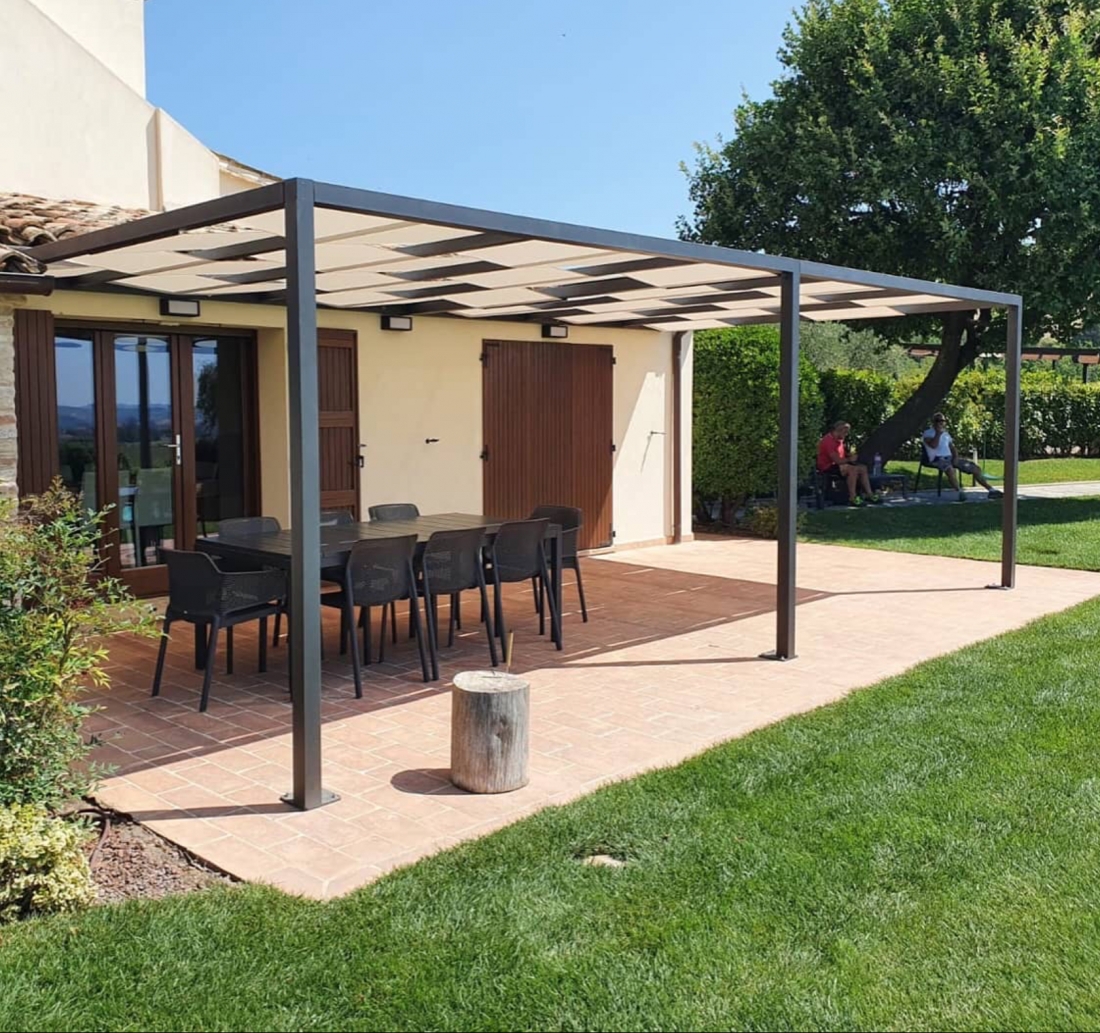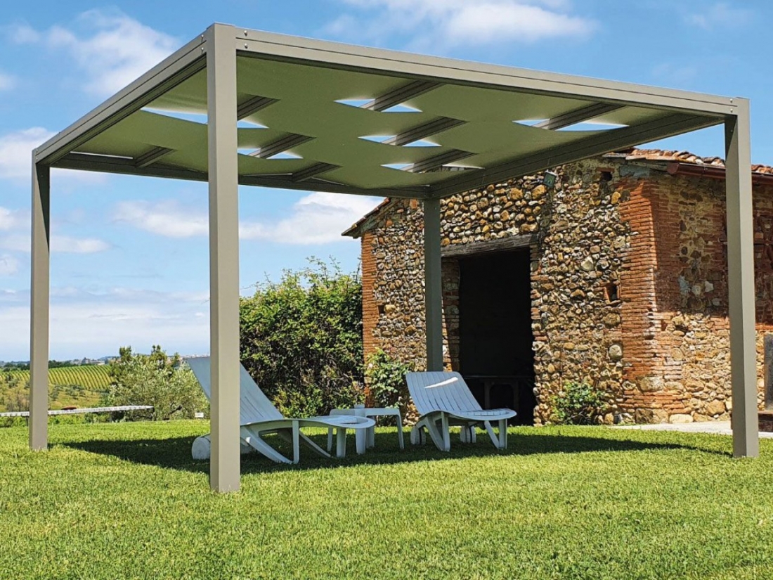 Pergola ombreggiante con teli intrecciati che rappresenta la perfetta fusione tra il design contemporaneo e l'archetipo di un capanno vegetale, creando così il più naturale e semplice dei sistemi di copertura. Attraverso l'estetica dinamica e accattivante della copertura, Summer offre un'ombra fresca e confortevole, trasformando gli spazi esterni in luoghi accoglienti dove vivere esperienze indimenticabili. La semplicità dei componenti, unita alla selezione di materiali di alta qualità, assicura al prodotto una lunga durata nel tempo. La manutenzione richiesta è minima e si limita alla pulizia generale dei profili in alluminio e della copertura.