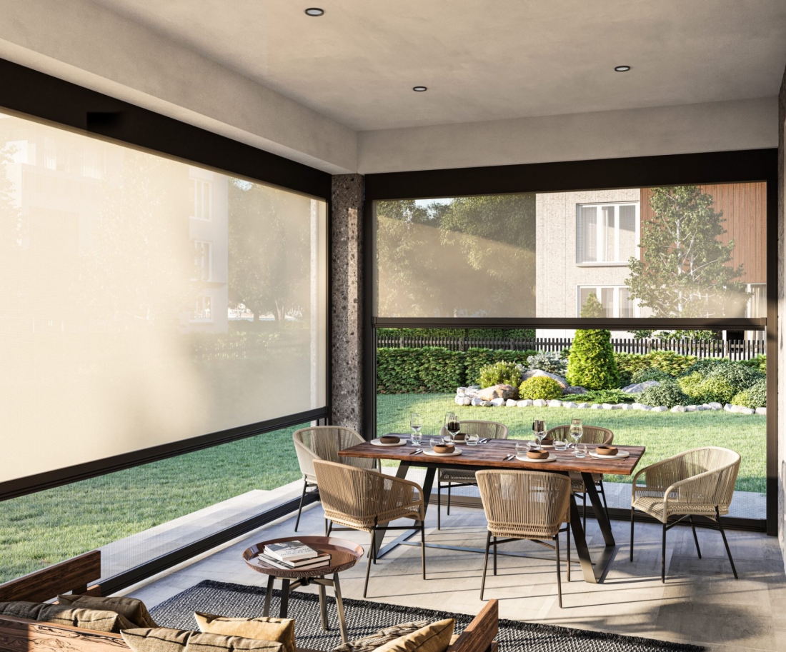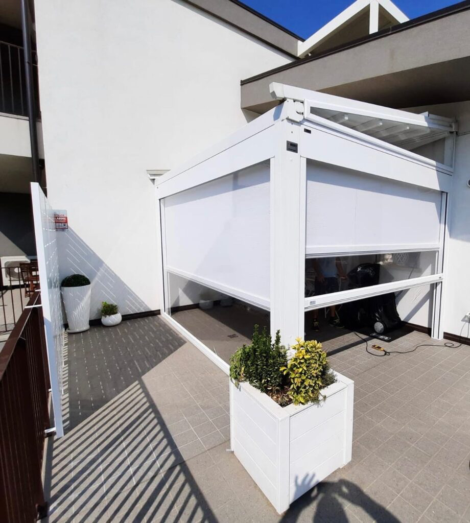 Tenda veranda doppio rullo estate inverno. Ideale per proteggere il tuo balcone dal sole, dal vento e dalla pioggia. La tenda veranda è un sistema pratico, semplice ed economico per verandare spazi e riparare il tuo balcone dal sole, dal vento e dalla pioggia con coperture retraibile. Per l'installazione non servono autorizzazioni o permessi comunali, non ci sono tasse da pagare e non aumenta la cubatura della casa. La tenda veranda GRANDINETTI è progettata per essere utilizzata 12 mesi all'anno in qualsiasi condizione atmosferica. Riduce il calore in estate come una perfetta tenda da sole, attenua il freddo d'inverno come una veranda in vetro e potrai ottenere un recupero termico fino a 10 gradi con un notevole risparmio energetico. Ripara dalla pioggia, dal sole e dal vento tutto l'anno. E'caratterizzata da due teli completamente indipendenti l'uno dall'altro, con movimentazione manuale o motorizzata Non necessita di manutenzione e i teli possono essere facilmente liberati dalle guide per una pratica pulizia. Il telo invernale i retinato antingiallimento, PVC o PVC cristal trasparente scorre all’interno di grandi guide in alluminio dotate di spazzolini per una chiusura ermetica; l'aggancio della tenda per bloccare il telo ed ottenere una perfetta trazione è automatico tramite due scrocchetti poi permettono di bloccare il telo ad altezze differenti. Il telo estivo è dotato di braccetti con molla in trazione con catena in acciaio inox con possibilità di uso fino a pavimento e nella senza dover sganciare il terminale dai braccetti. Il cassonetto copritelo solo esterno o totale (fornito in optional) dalla linea elegante ed essenziale garantisce la pulizia e la durata dei tessuti e riduce tutte le infiltrazioni di aria e acqua.