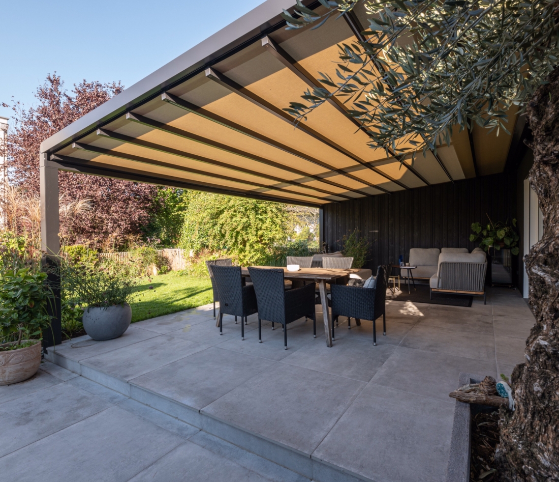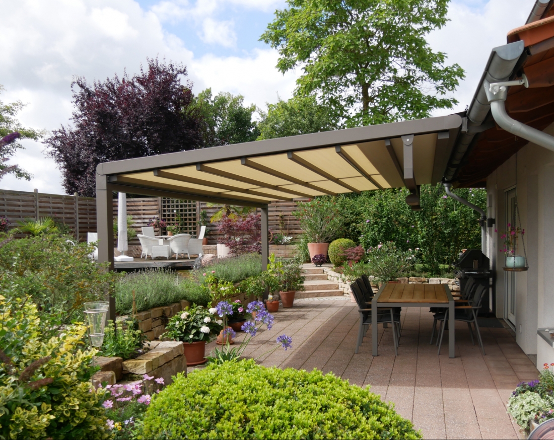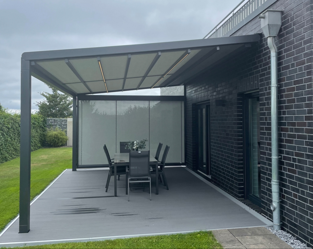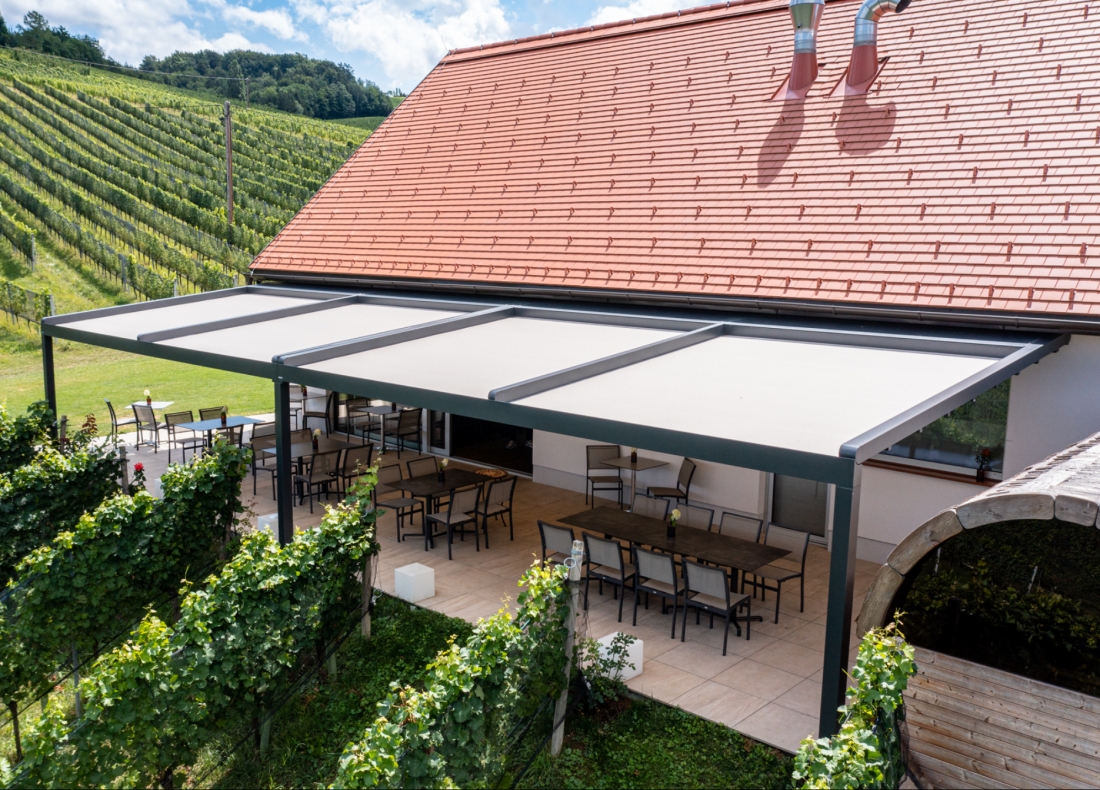 La nuova Pergola Stretch Markilux è in grado di offrire una completa protezione dalle intemperie, anche su dimensioni importanti. Il giusto impianto permette di realizzare spazi per mangiare all'aperto da utilizzare in ogni momento della giornata. La pergola è realizzabile con dimensioni massime di 7 metri per 7 in un sistema a modulo singolo. Inoltre, la tenda da sole può essere accoppiata a più moduli per un totale di 25 metri per 7, dimostrando le sue grandi potenzialità. Ogni modulo è azionato dal proprio motore con tecnologia radio. La particolarità della "versione stretch" è l'innovativo ingranaggio che è in grado di trasferire la forza di trasporto in modo ottimale al telo. L'ingranaggio è alloggiato nella scatola frontale insieme all'impianto elettrico per la gestione di illuminazione e climatizzazione. È collegato alle pulegge della cinghia dentata nelle guide ed è pretensionato in fabbrica. Questa pergola-pergotenda offre anche la possibilità di integrare le tende da sole verticali con finestre panoramiche da utilizzare come schermi per la privacy, protezione dal vento o dalla pioggia che cade di lato.