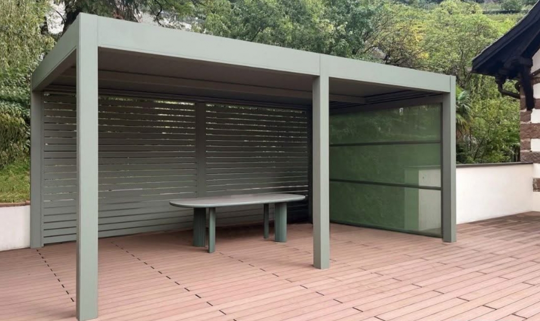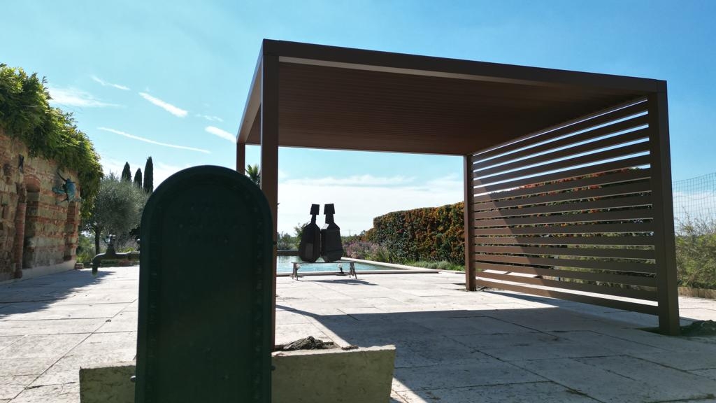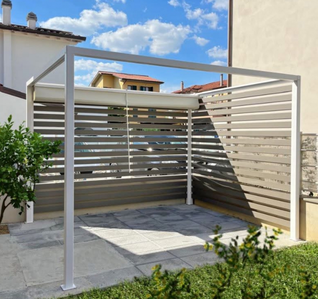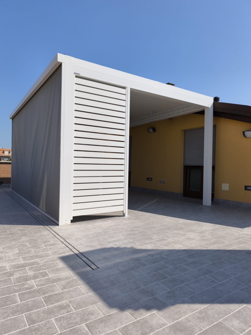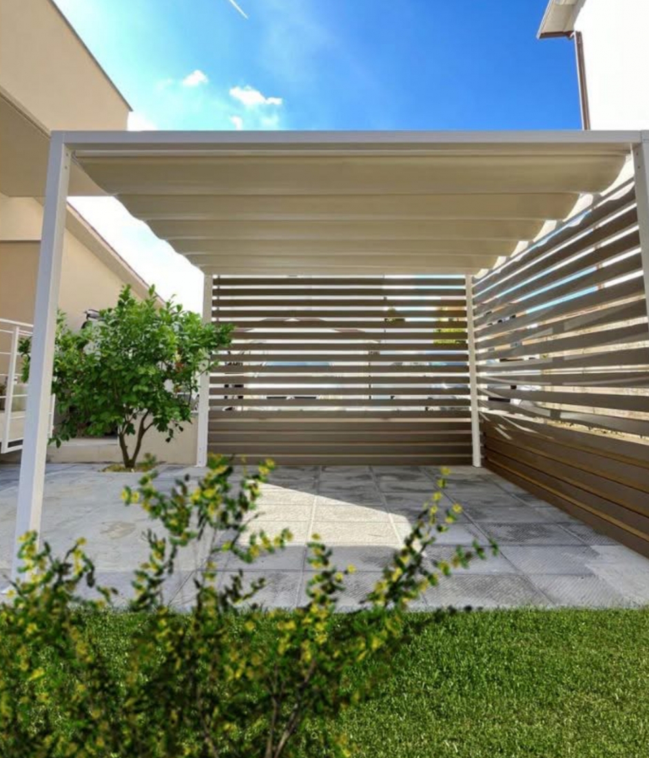 Sistema di chiusura perimetrale con barre frangisole dal design moderno e contemporaneo, a scelta fisse o orientabili con sistema di movimentazione manuale (argano e manovella). Profili in alluminio estruso verniciato a base di resina di poliestere, altamente resistenti alla corrosione anche fronte mare. Lamelle di dimnsione 101x40 mm ancorate a telai/strutture in alluminio perimetrali. Di serie spazio libero tra le lamelle pari a 2 cm. Montabili sia in orizzontale e sia in verticale. Donano un tocco di design e privacy in più, utilizzabili ai lati di una pergola o come parapetto o separé.